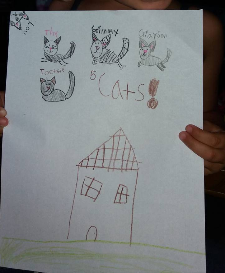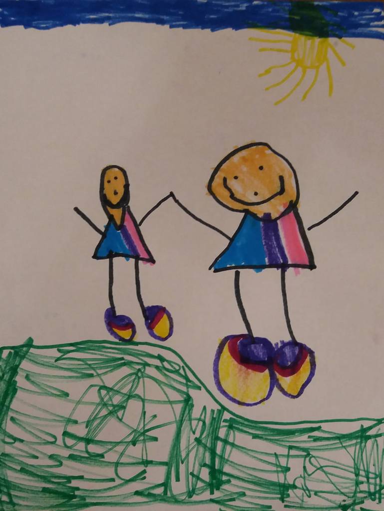 These are drawings from a 5, almost 6 year old girl in foster care. In some of her early drawings from a year ago and you can clearly see how she has developed and grown in self esteem (she goes from smaller to larger) and how strongly connected she feels to her foster mom (how close they are/touching). When she first came into care with her current foster mom at 4 years old all she could do was put stickers onto paper. Now she spends a lot of time on the details. She would love to be an art teacher when she grows up!
